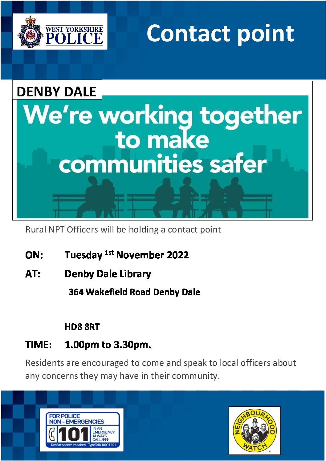 Drop-in sessions do prove to be very useful for residents in and around the Denby Dale area. Come along to speak to us about anything you may have concerns about .Get information about Neighbourhood Watch and how to set up one on the street/road etc where you live.