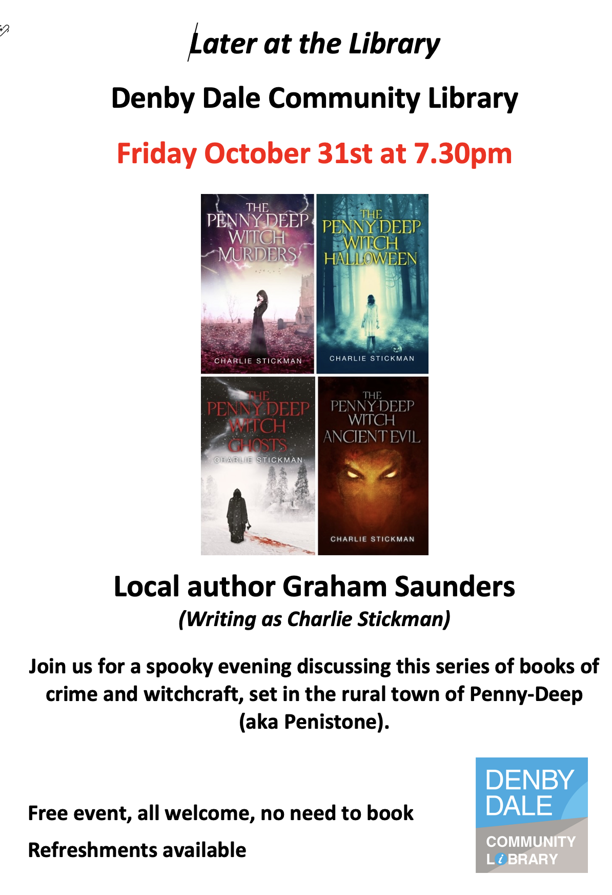 Join us for a spooky evening discussing with local author, Graham Saunders, his series of books, of crime & witchcraft set in the rural town of Penny-deep (aka Penistone). Free event, all welcome, no need to book, refreshments available