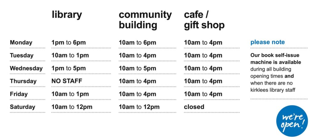 Our partnership with Kirklees Library Services means we have a professionally-managed library. As a library member you can access this full range of local authority library services: