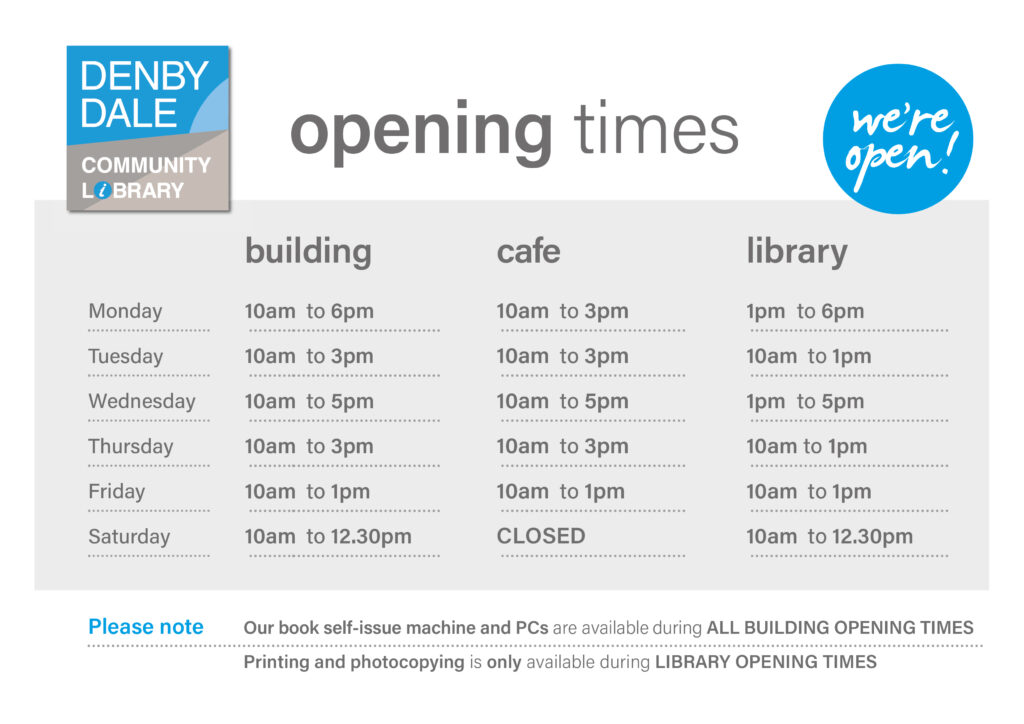 The community building is open:MONDAY 10am to 6pmTUESDAY 10am to 3pmWEDNESDAY 10am to 5pmTHURSDAY 10am to 3pmFRIDAY 10am to 1pmSATURDAY 10am to 12.30pm The library is open: MONDAY 1pm to 6pmTUESDAY 10am to 1pmWEDNESDAY 1pm to 5pmTHURSDAY 10am to 1pmFRIDAY 10am to 1pmSATURDAY 10am to 12.30pm The Kirkwood Cafe is open:MONDAY 10am to 3pmTUESDAY10am to 3pmWEDNESDAY 10am to 5pmTHURSDAY 10am to 3pmFRIDAY 10am to 1pmSATURDAY: Can you volunteer so we can open?